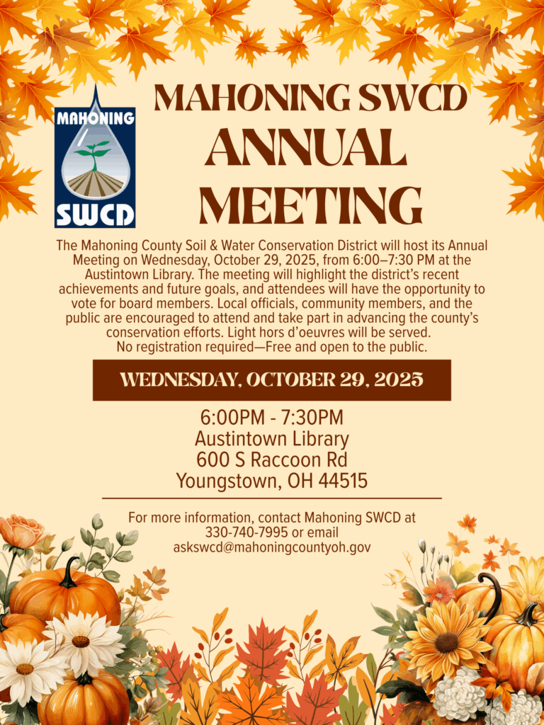 Mahoning County, OH — Mark your calendars! The Mahoning County Soil & Water Conservation District (SWCD) will host its Annual Meeting on Wednesday, October 29, 2025, from 6:00 to 7:30 PM at the Austintown Library.