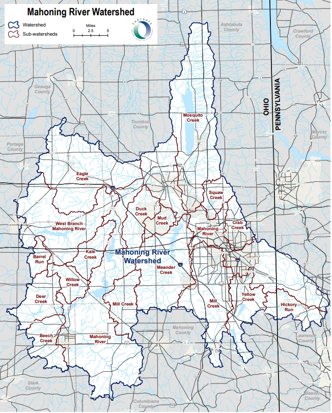 Downstream, the Lower Mahoning River Watershed covers 40,000 acres, including McKelvey Lake and portions of the Mahoning River that run through Youngstown, Campbell, Lowellville, Struthers, Austintown, Coitsville, Poland, and Boardman Townships.